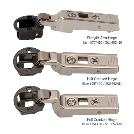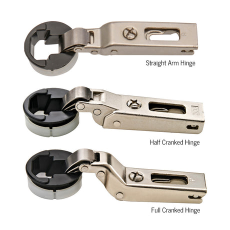 We offer BLUM's signature glass door hinge, which is well-suited to inset, overlay, and twin overlay glass doors. This innovative hinge system features a 94-degree opening angle and three-dimensional adjustment for your convenience. This European-style hinge comes in three different configurations: straight arm for overlay doors, half-cranked for twin overlay doors, and full-cranked for inset doors. Simply select the hinge, mounting plate, and cover cap you desire. Sugatsune's overlay glass door hinge is ideal for frameless cabinet doors and glass thickness ranging from 4 to 6mm. Each European hinge is made up of four parts: the hinge, the mounting plate, the cover cap for the shim, and the cover cap for the hinge arm. You may need at least two hinges per door depending on the application.